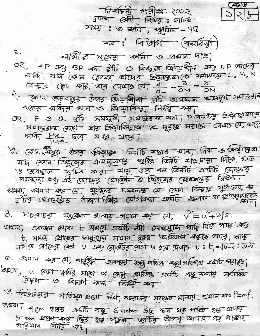 ২০১২ সালের নির্বাচনী পরীক্ষার প্রশ্ন (গণিত)