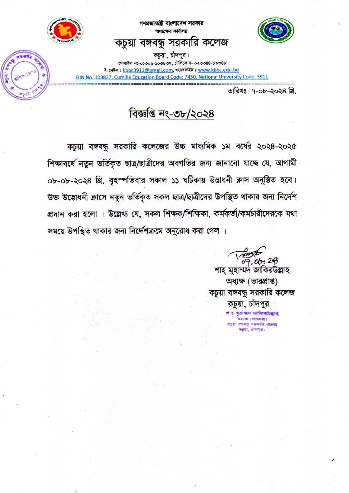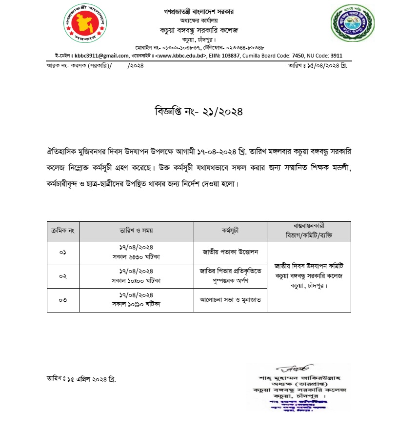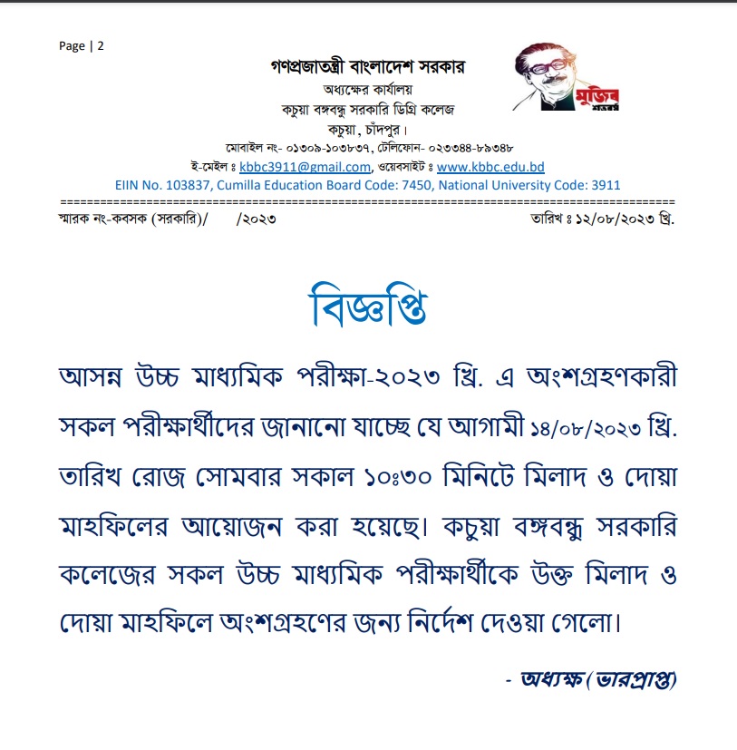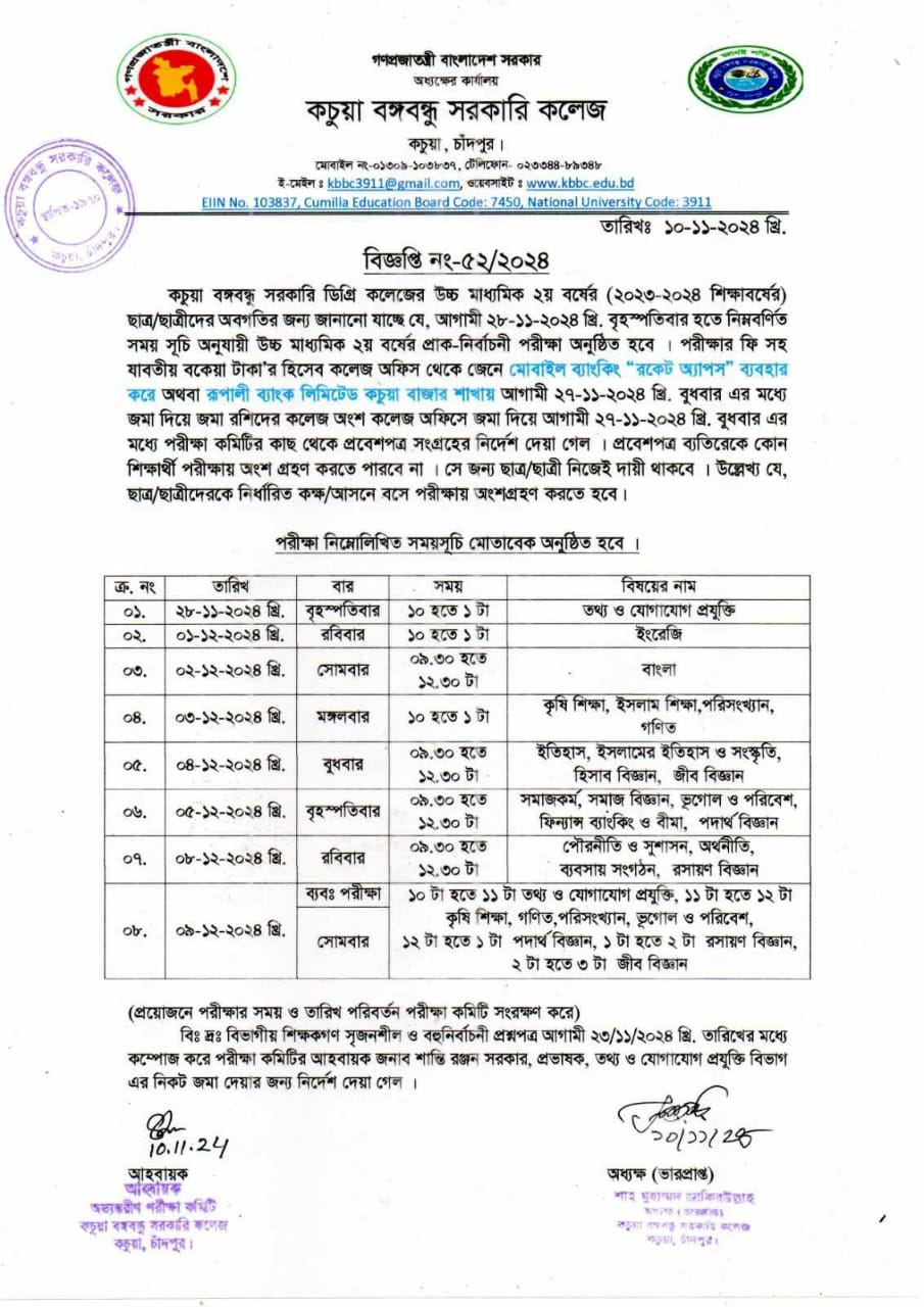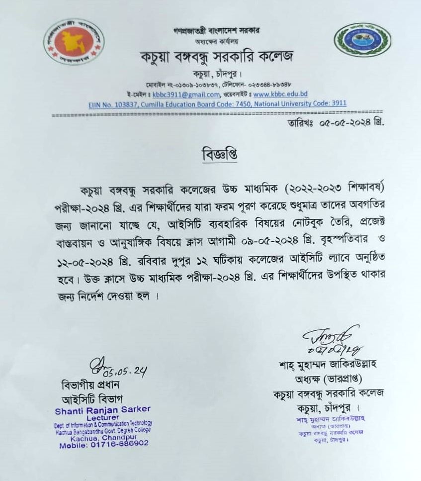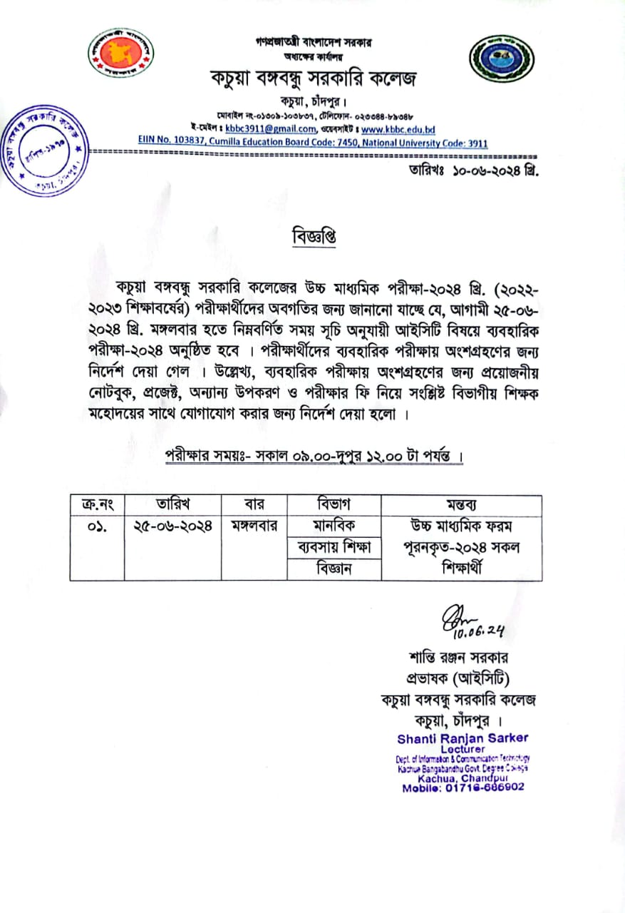 কচুয়া সরকারি ডিগ্রি কলেজের ২০২৪-২০২৫ শিক্ষাবর্ষের (১ম বর্ষ) ডিগ্রি পাস ভর্তিকৃত সকল ছাত্র/ছাত্রীদেরকে রুটিন মোতাবেক ক্লাস করার জন্য নির্দেশ প্রদান করা হলো |