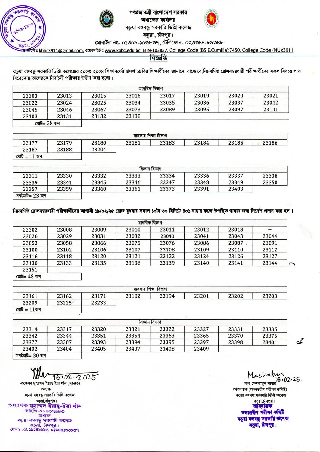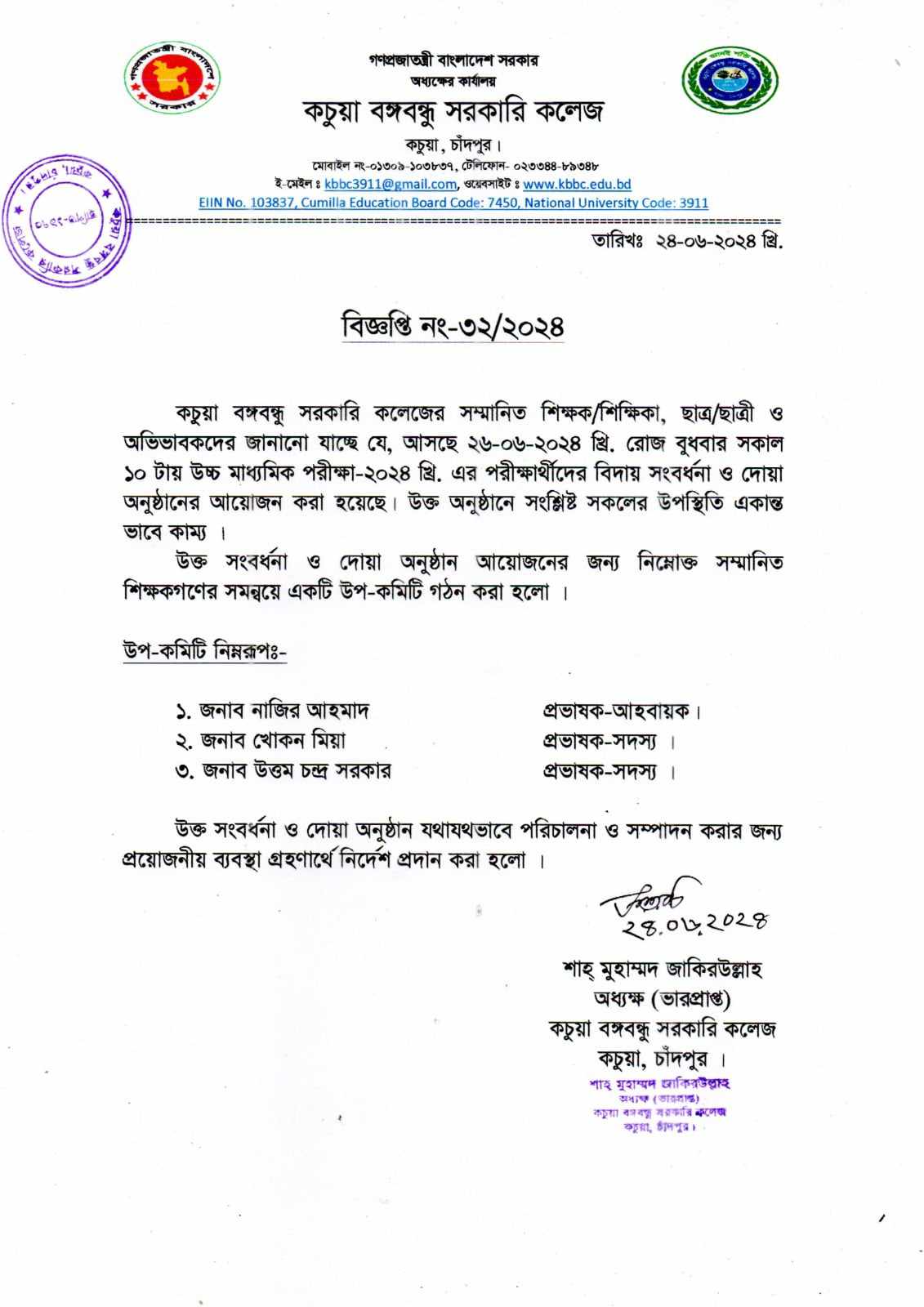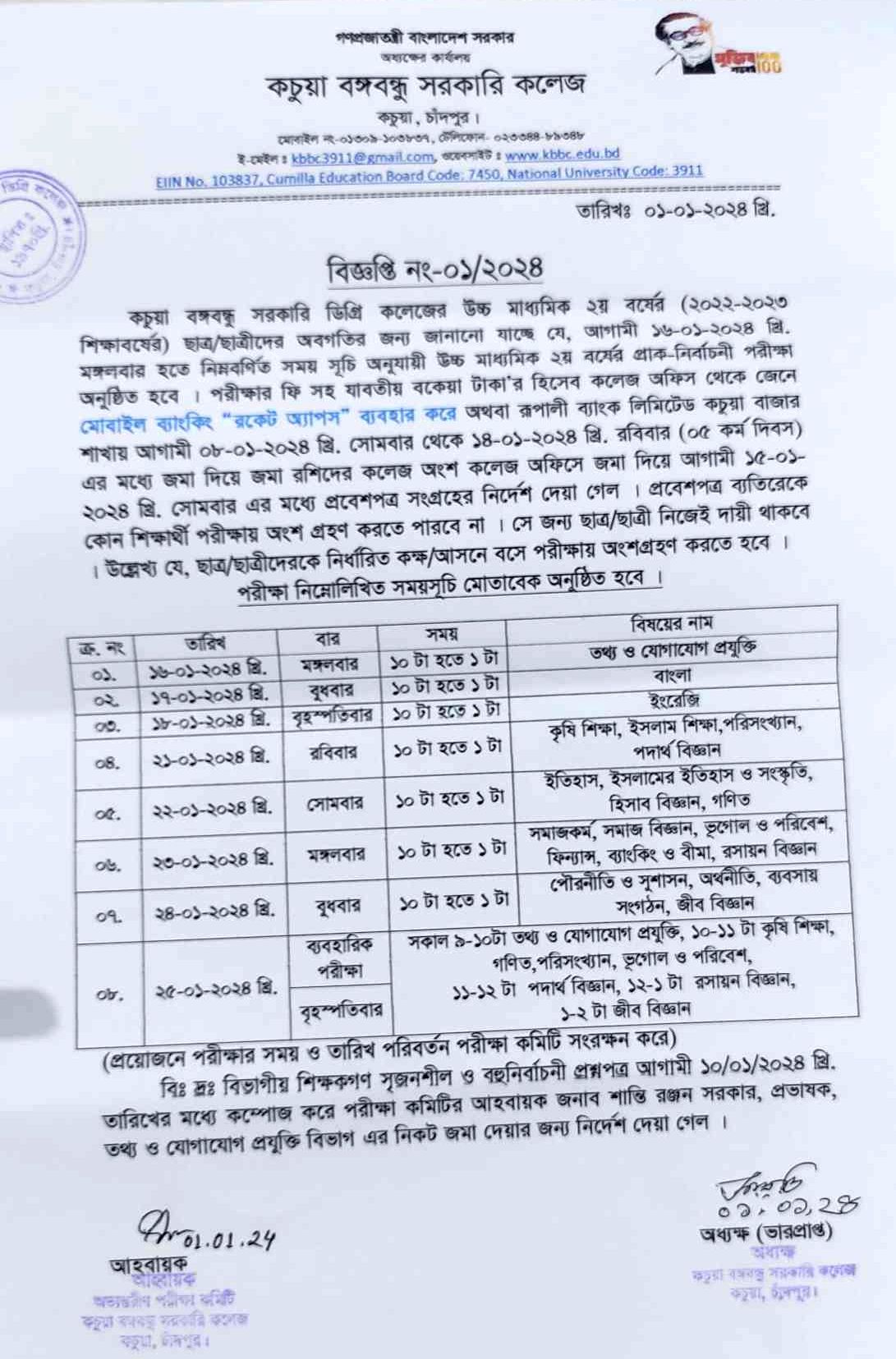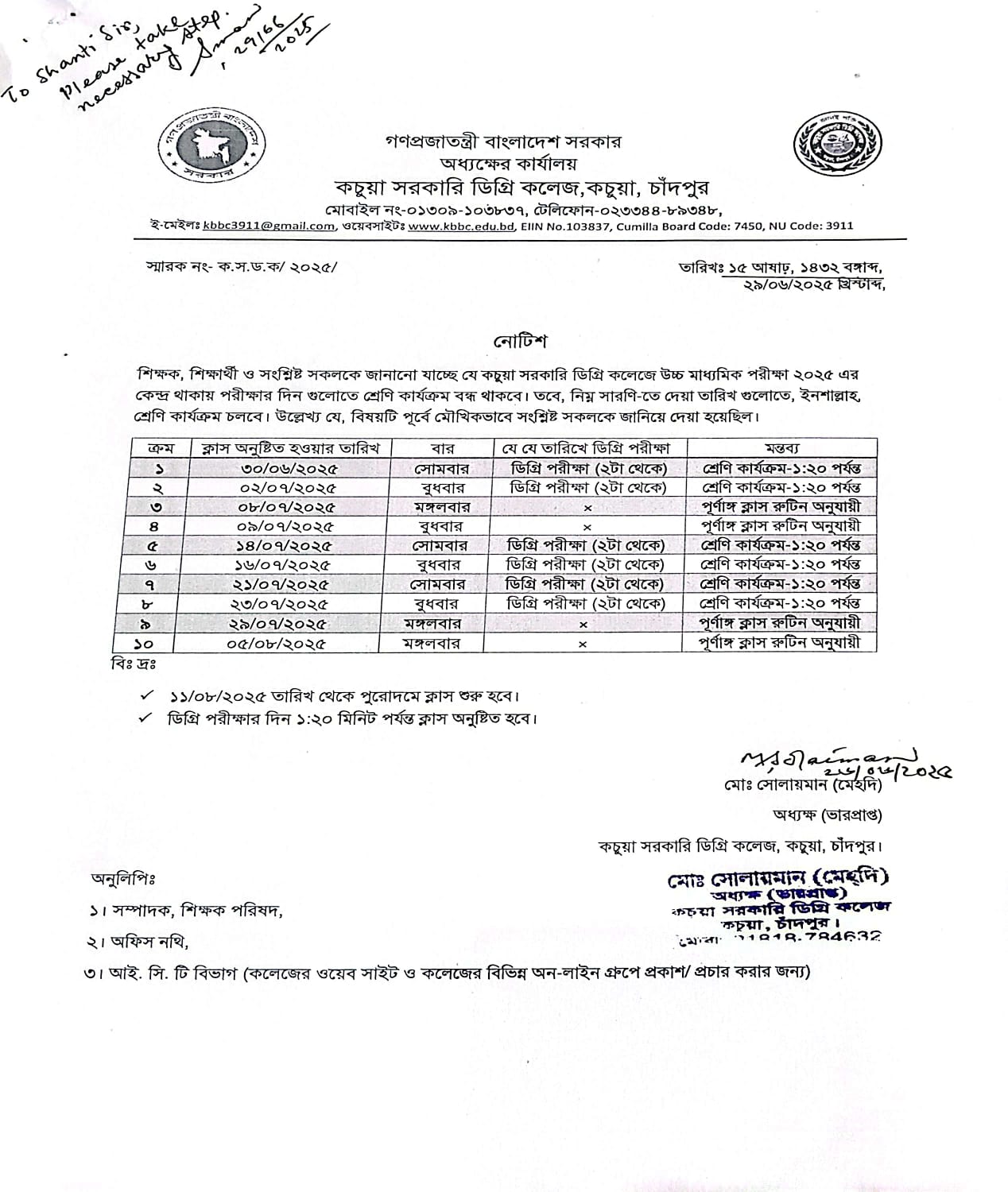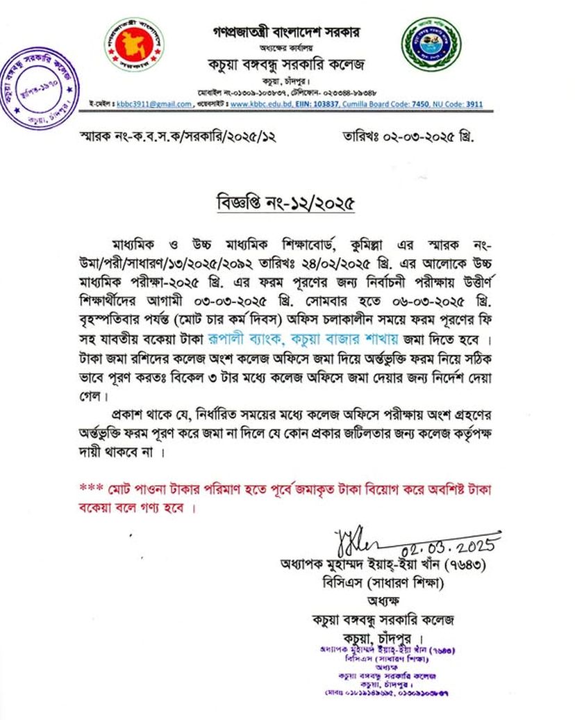 কচুয়া সরকারি ডিগ্রি কলেজের ২০২৫-২০২৬ শিক্ষাবর্ষের (১ম বর্ষ) উচ্চ মাধ্যমিক শিক্ষা বোর্ড কর্তৃক প্রদত্ত মূল রেজিষ্ট্রেশন প্রিন্ট কপিতে স্বাক্ষর |