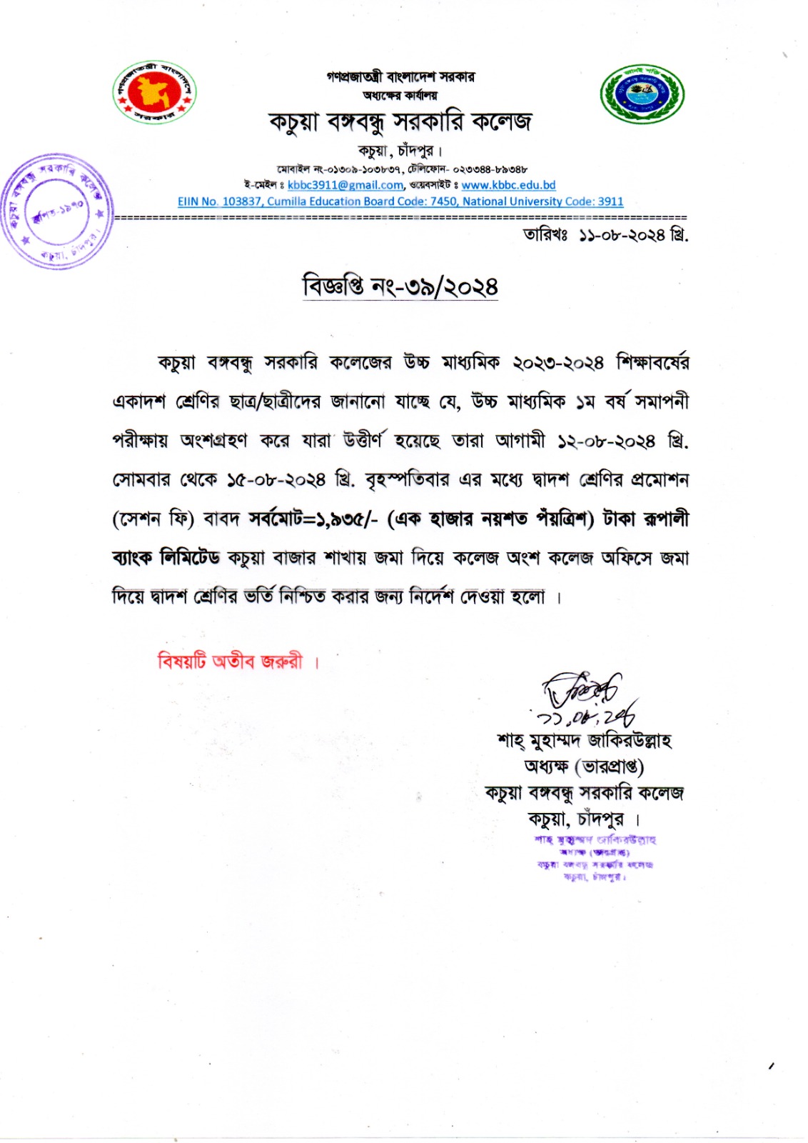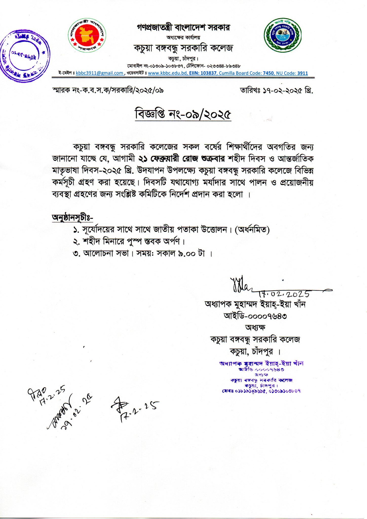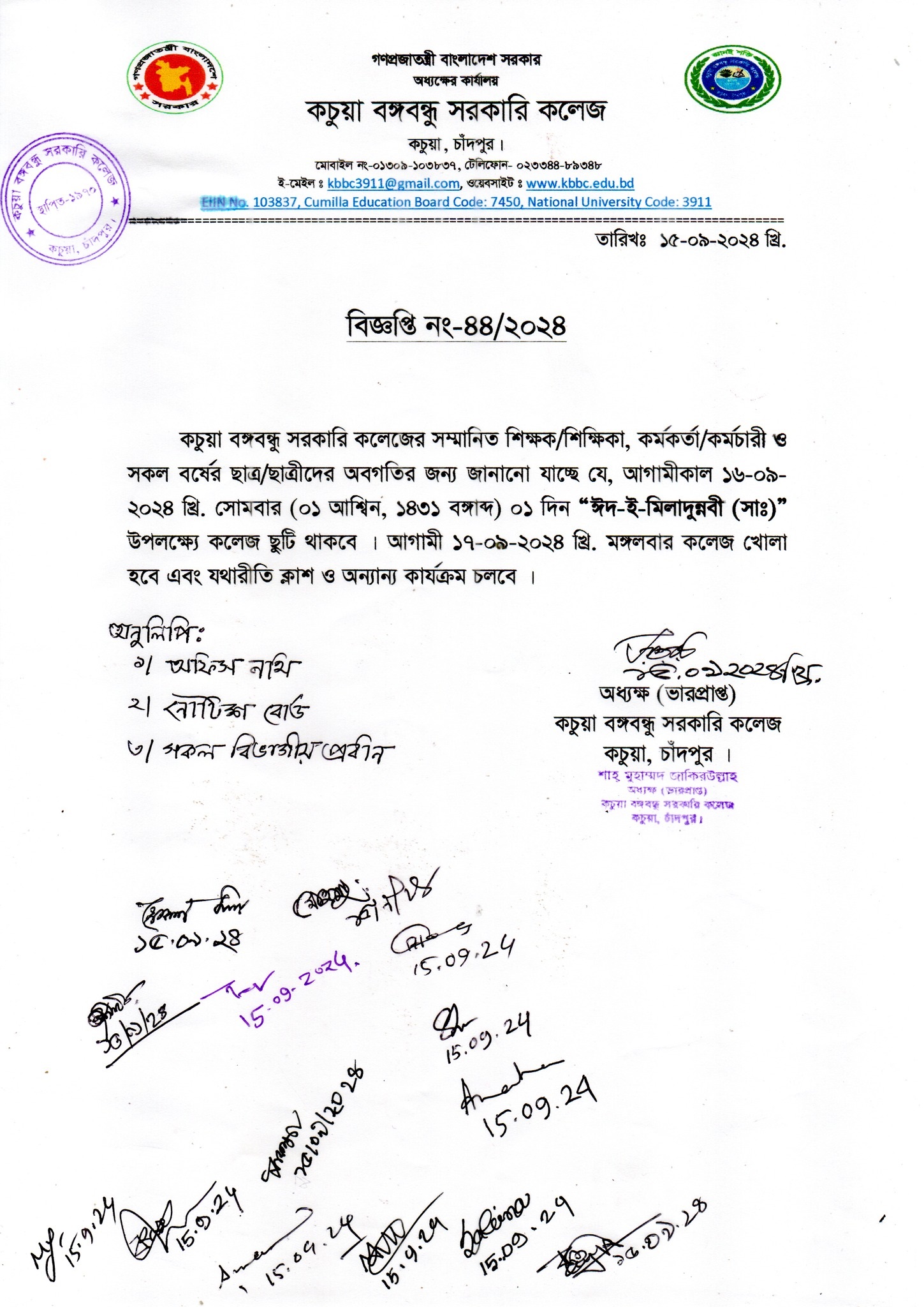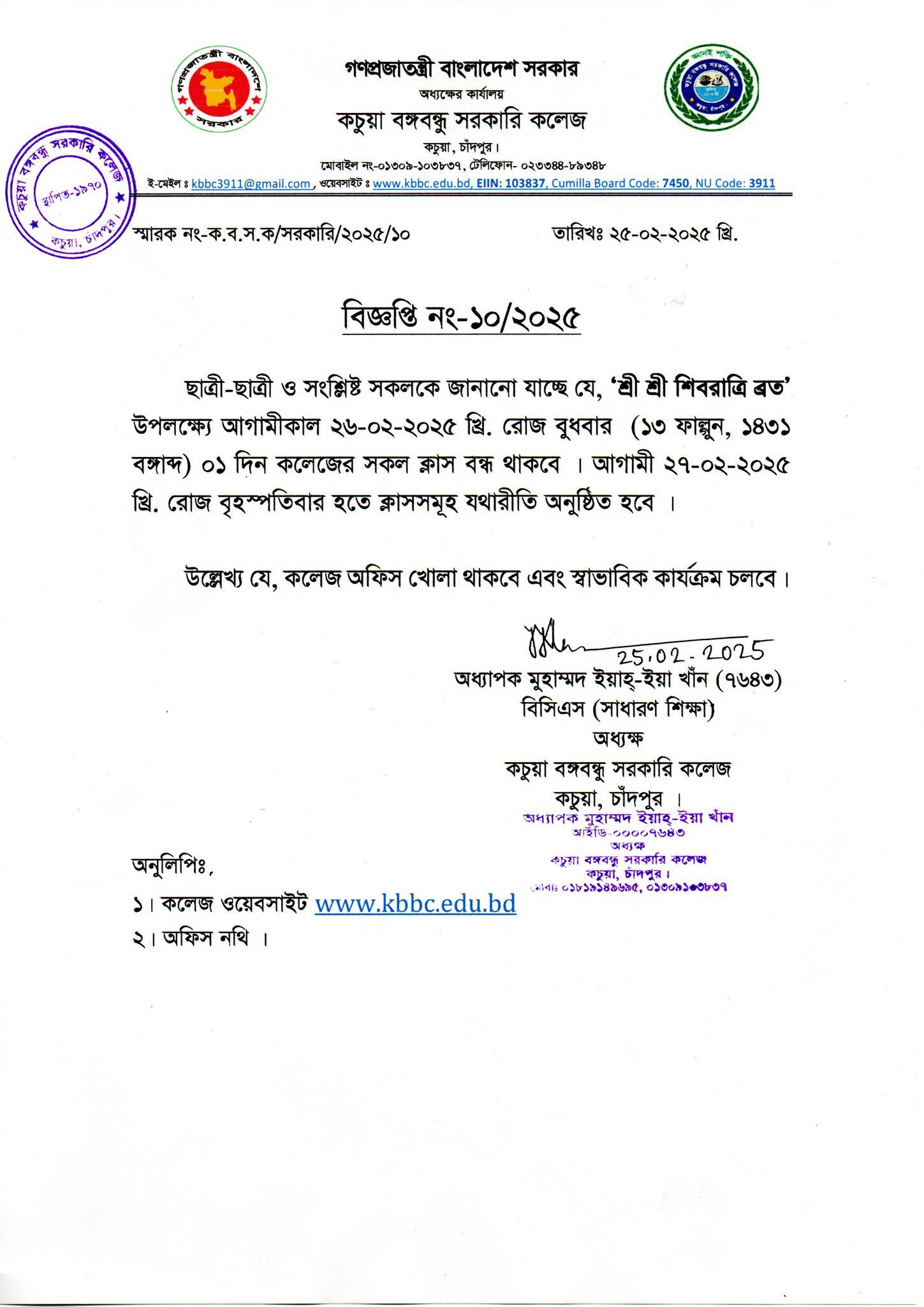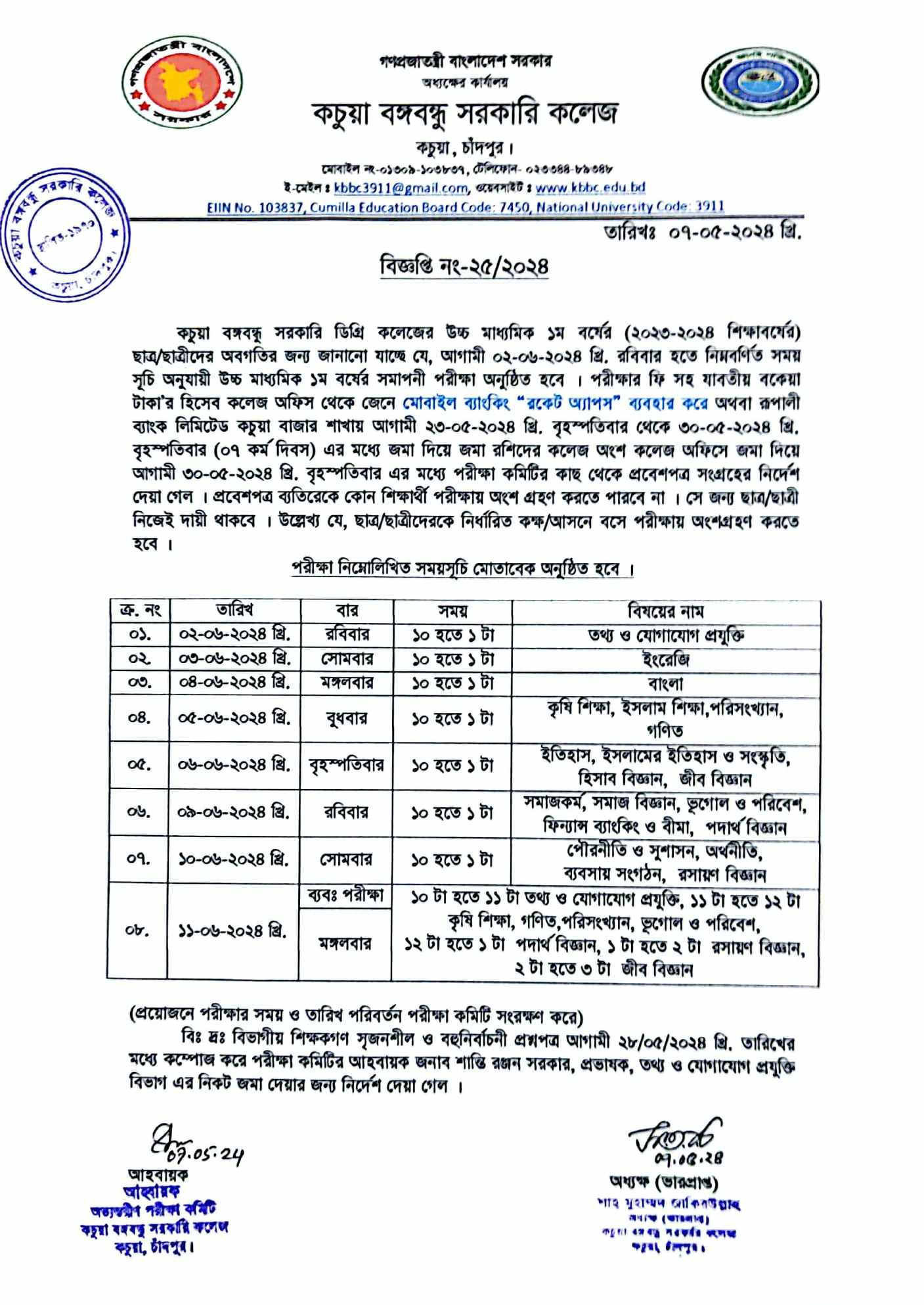 কচুয়া সরকারি ডিগ্রি কলেজের ২০২৫-২০২৬ শিক্ষাবর্ষের (১ম বর্ষ) উচ্চ মাধ্যমিক শিক্ষা বোর্ড কর্তৃক প্রদত্ত মূল রেজিষ্ট্রেশন প্রিন্ট কপিতে স্বাক্ষর |